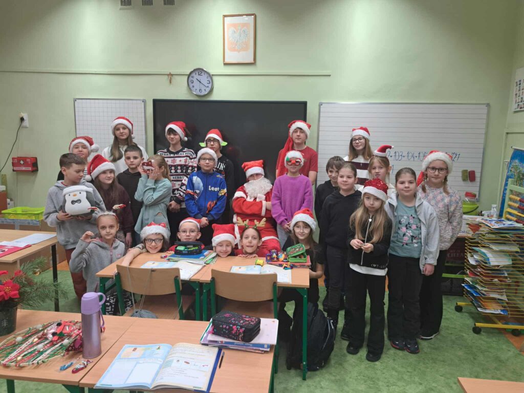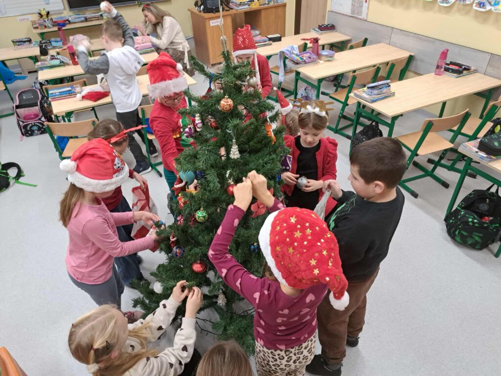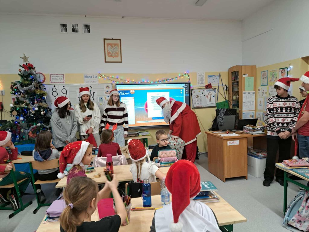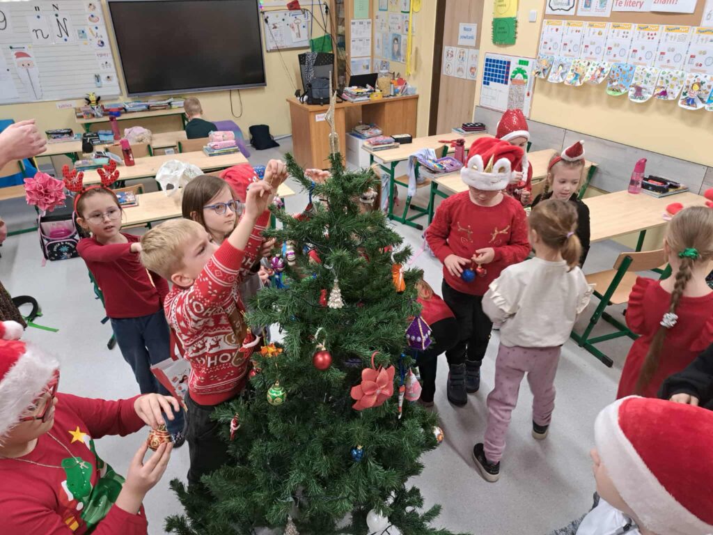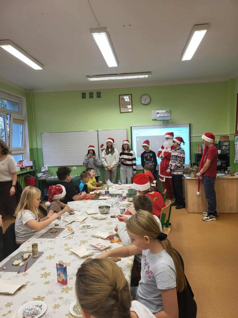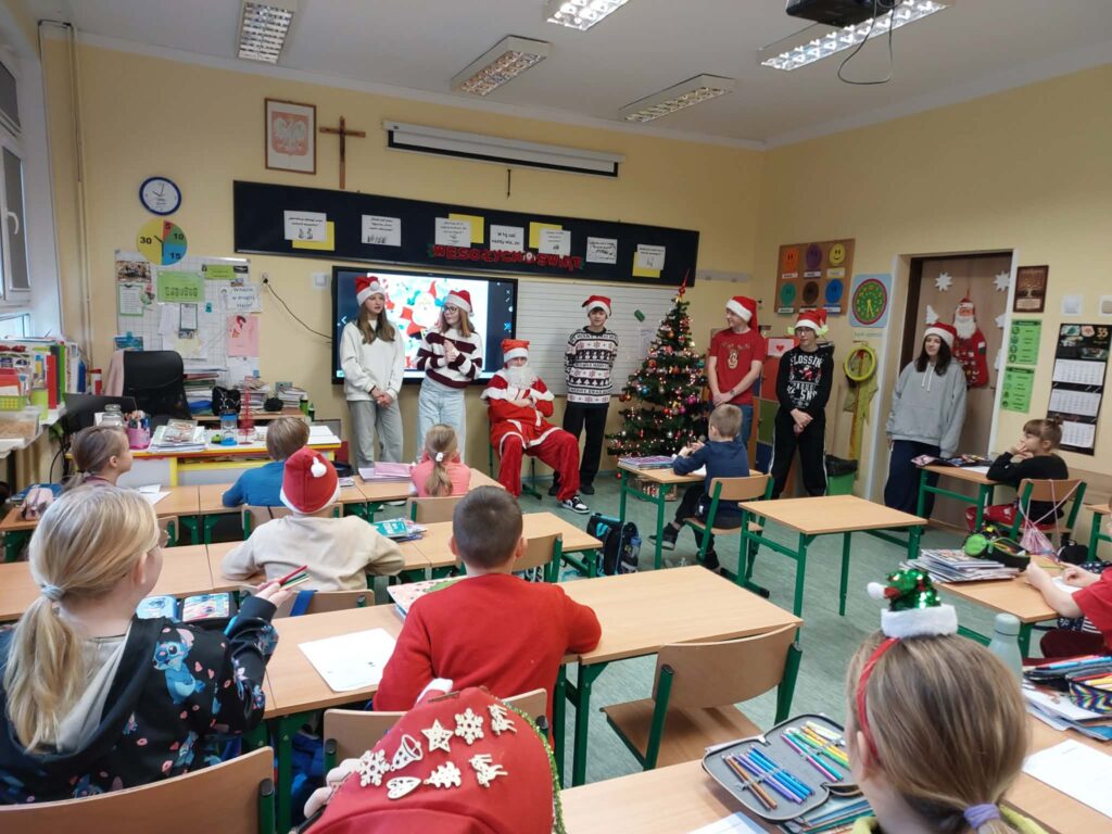 W klasach odbywały się krótkie zabawy, wspólne śpiewanie świątecznych piosenek i ubieranie klasowych choinek. Nie zabrakło też wizyty „Mikołaja” z samorządu uczniowskiego, który przybył w otoczeniu swoich elfów i przyniósł dzieciom upominki.