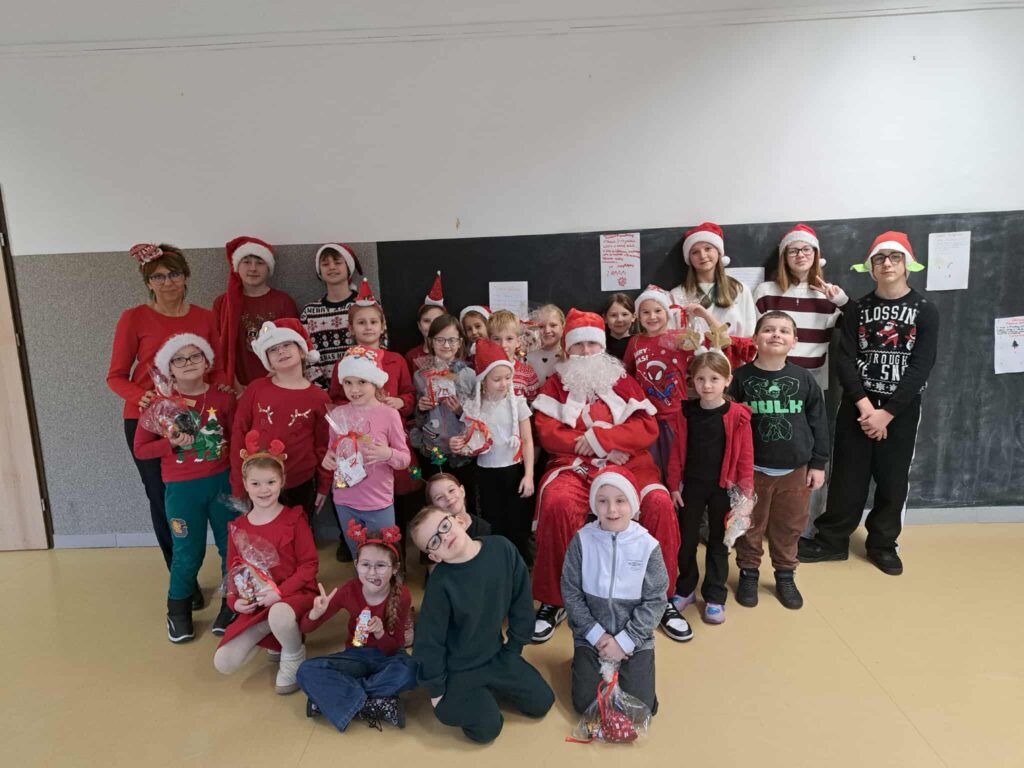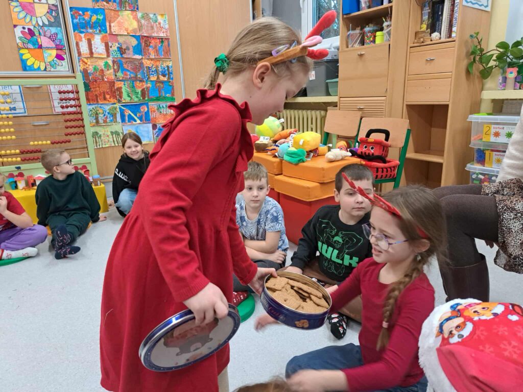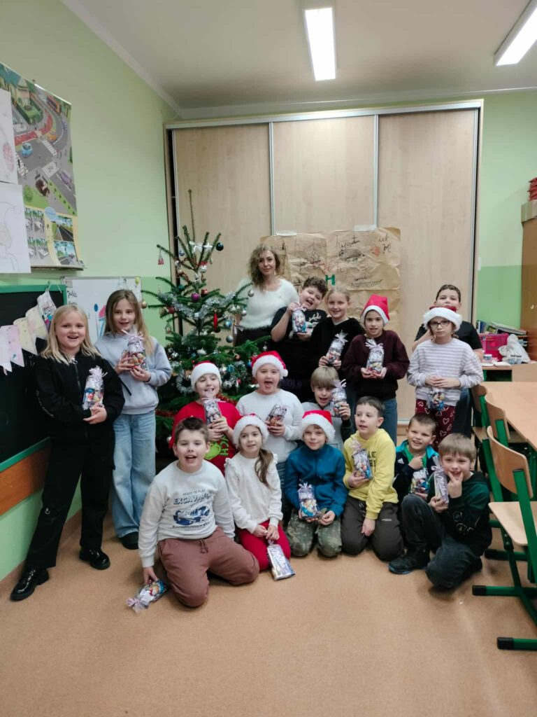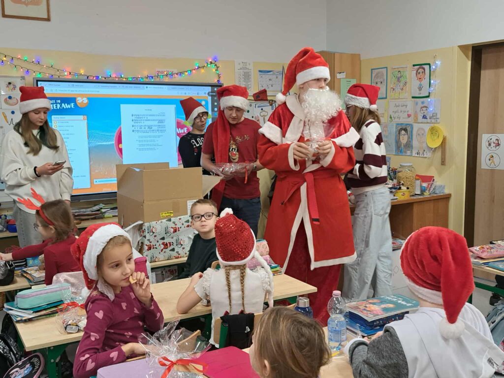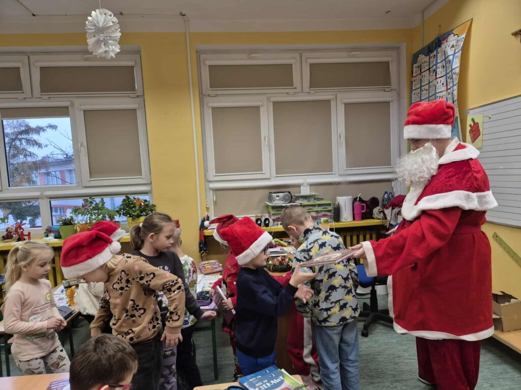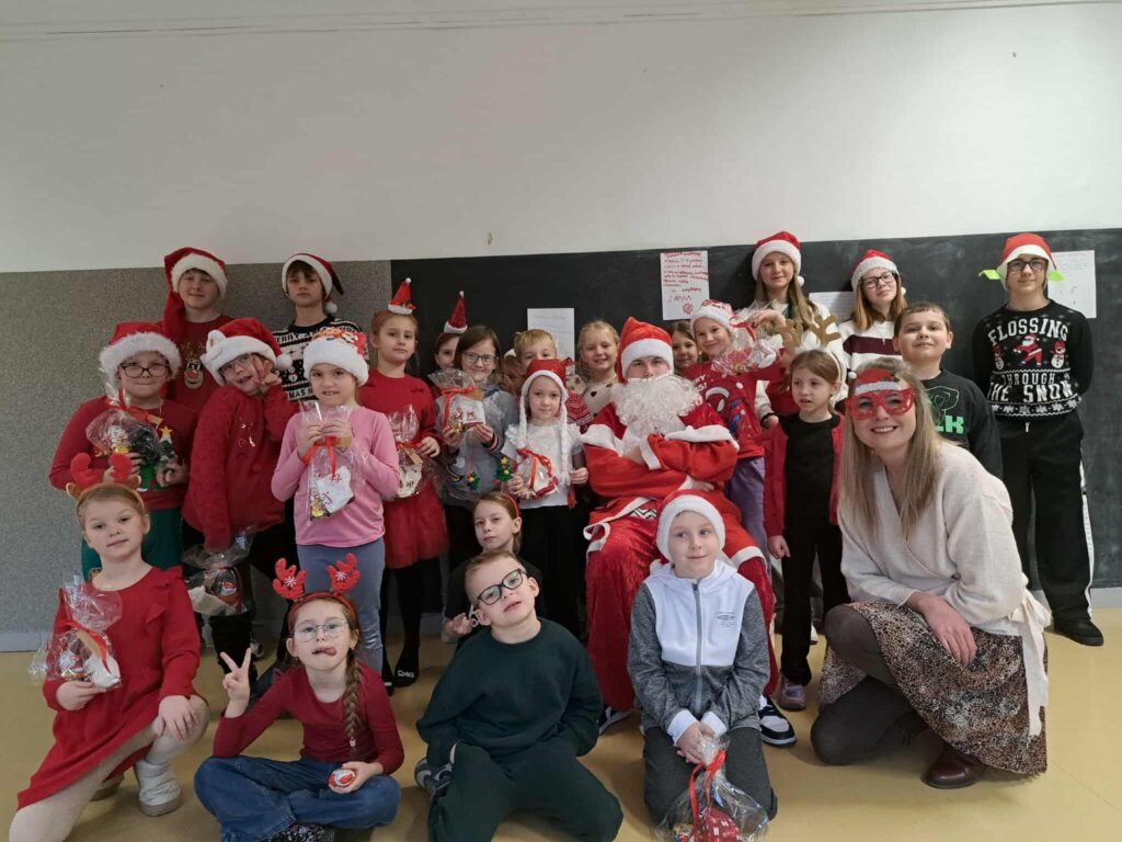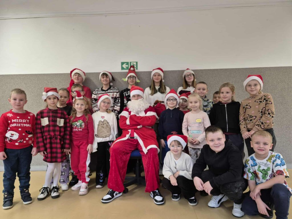W klasach odbywały się krótkie zabawy, wspólne śpiewanie świątecznych piosenek i ubieranie klasowych choinek. Nie zabrakło też wizyty „Mikołaja” z samorządu uczniowskiego, który przybył w otoczeniu swoich elfów i przyniósł dzieciom upominki.